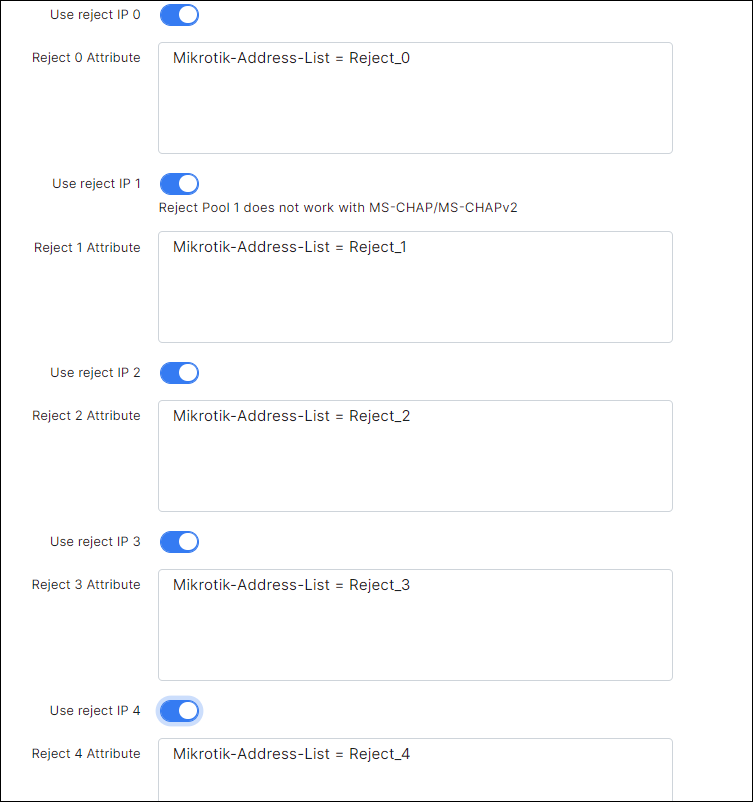 By default, Radius allows connection (sends Radius-Accept) even if there is an authorization error. In the case of authorization errors, Radius will assign an IP address from reject address pools (lists). By default, these pools are 10.250.x.0/20. Pools can be configured in Config → Networking → Radius, as shown on the screenshot below: